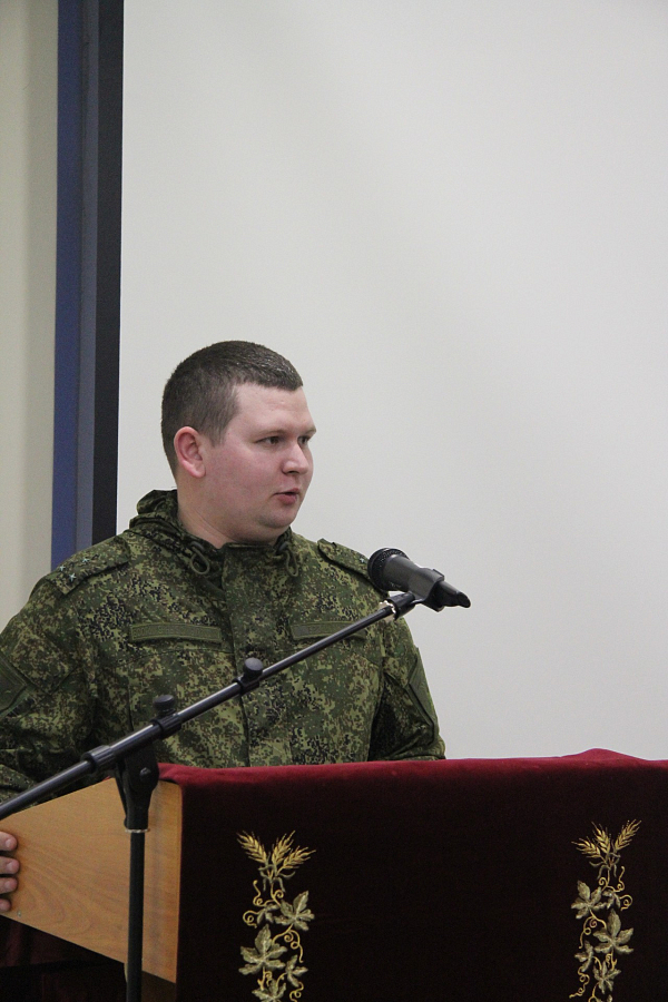 С.Н. Броцман, старший лейтенант, замполит роты «Современная Российская Армия», представитель космических войск России, кратко обрисовав круг инженерных специальностей в армии, обеспечивающих космос, космическую и иную разведку, а также развитие систем противовоздушной и противоракетной обороны, перешел к представлению армейских профессий в целом, подчеркивая высокий статус армии в нашей стране, перспективность работы в армии. Также речь шла о высоком христианском идеале, которому российская армия служит со времен святых воинов и благоверных князей, – о том, что «нет любви большей, чем положить жизнь за други своя».