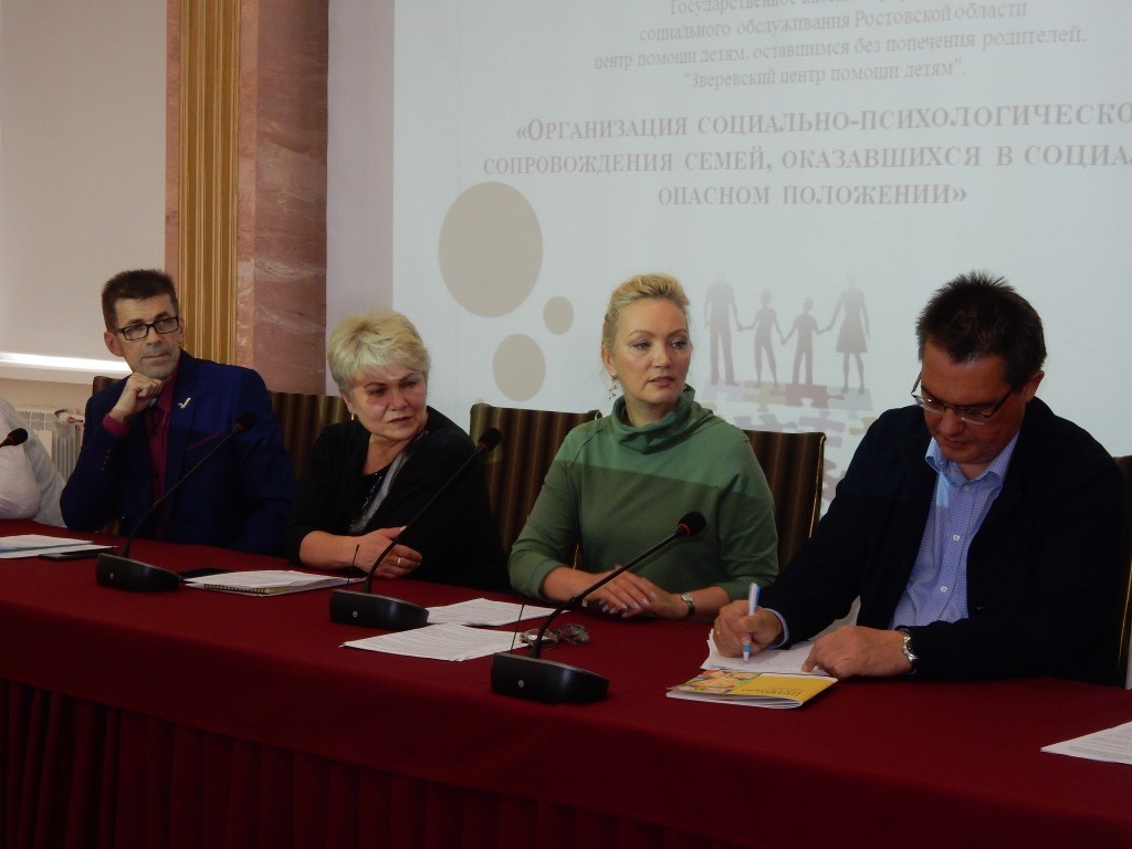 Два из представленных на круглом столе докладов прозвучали со стороны дистанционных участников заседания – сотрудников Центра помощи детям, оставшимся без попечения родителей г. Зверево Ростовской области. Директор Зверевского центра помощи детям Е. В. Бобкина рассказывала об опыте службы сопровождения замещающих семей, а педагог-психолог этого же центра Д. С. Ганько – об организации социально-психологического сопровождения семей, оказавшихся в социально опасном положении, то есть семей, родителям в которых грозит лишение родительских прав. Ростовчане высказали предложение по возможности включить в программу готовящихся курсов повышения квалификации оба направления деятельности – как работу с приемными семьями, так и профилактику социального сиротства.