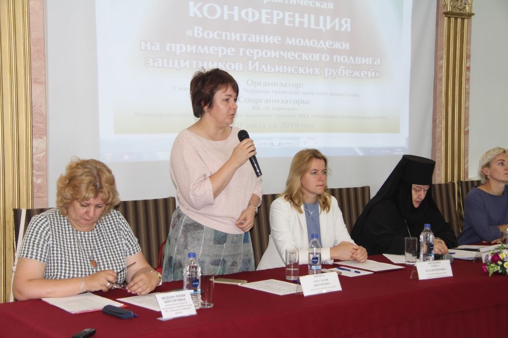 Настоятельница Свято-Никольского Черноостровского женского монастыря игумения Николая зачитала доклад, в котором подводились итоги реализации проекта создания интерактивного музея «Малоярославец – город двух побед» и рассказывалось о перспективах создания в Андреевском скиту обители на территории поселения Ильинское интерактивного музейно-образовательного мемориального комплекса с храмом-памятником, в котором будут поминаться имена защитников Ильинских рубежей. В заключение доклада игумения Николая призвала участников конференции поддержать проект, оказав ему информационную, организационную, консультативную и иную помощь.