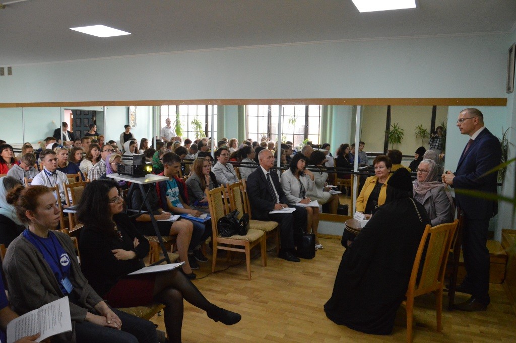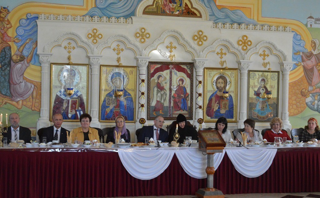 По окончании трапезы все гости были приглашены в актовый зал НОУ «Православная гимназия» на территории Свято-Никольского Черноостровского женского монастыря. Работу дискуссионной площадки № 4 «Поколение-2020: духовно-нравственные ценности, жизненные планы и перспективы» открыли настоятельница игумения Николая и Уполномоченный МИД России по вопросам прав человека, демократии и верховенства права К.К. Долгов.
