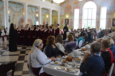 Организаторы и участники дискуссионной площадки в количестве более 110 человек были приглашены в зал праздничной трапезной монастыря. После приветственного слова настоятельницы Свято-Никольского Черноостровского женского монастыря игумении Николаи (Ильиной) гостям была предложена трапеза и небольшой концерт, подготовленный воспитанницами монастырского детского приюта «Отрада». Девочки исполнили несколько номеров классических хоровых произведений, а затем ансамбль «Отрада» выступил с русскими народными танцами. В завершение концерта Уполномоченный МИД России по вопросам прав человека, демократии и верховенства права К.К. Долгов обратился к игумении Николаи и директору приюта «Отрада» монахине Александре со словами признательности и благодарности за нелегкий труд и подвиг достойного, высоконравственного и духовного воспитания детей.