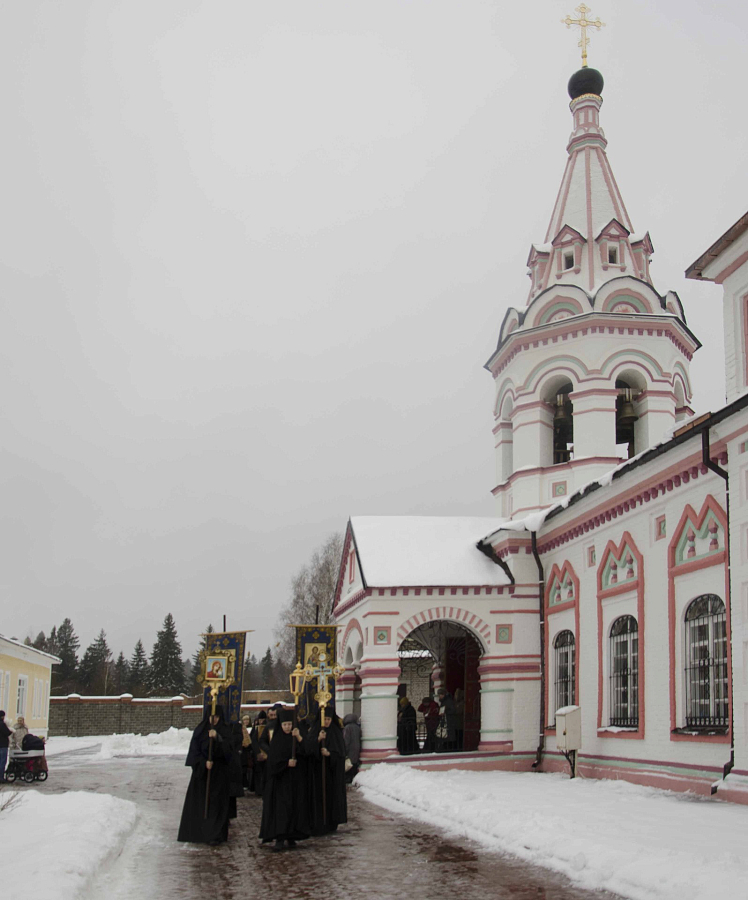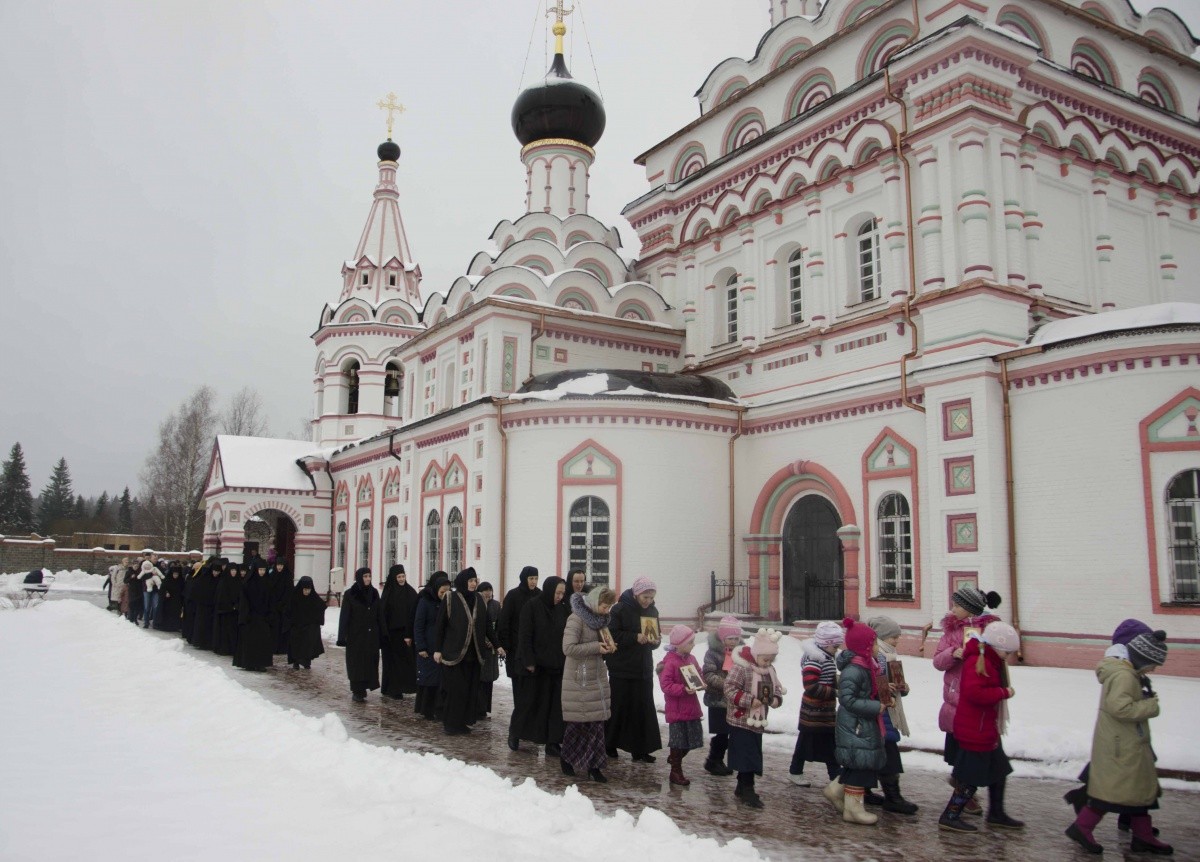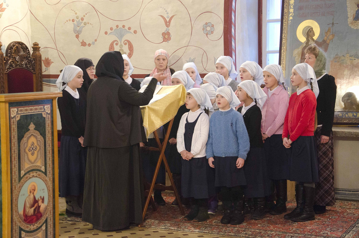 За богослужением молились настоятельница монастыря игумения Антония (Минина) с сестрами, воспитанницы, воспитатели и учителя Александровской гимназии. Детский хор пробует исполнять церковные песнопения под руководством монастырской послушницы. Все тексты девочки учат наизусть, разбирая с учителем смысл церковнославянских слов.