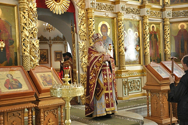 Его Высокопреподобию сослужили братия обители в священном сане.