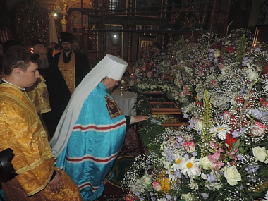 Накануне торжеств, 10 июня, всенощное бдение с чтением акафиста святителю Луке возглавил митрополит Лазарь в сослужении клириков собора и симферопольского духовенства.