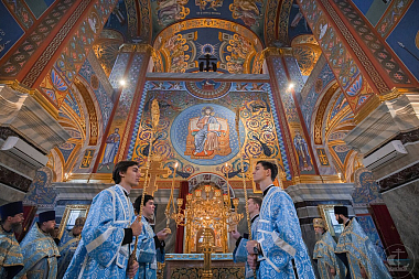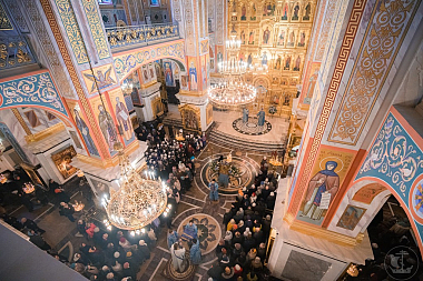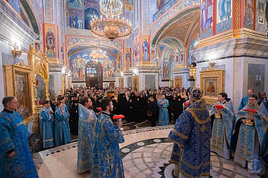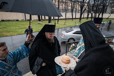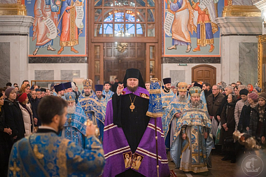Его Преосвященству сослужили: первый проректор заслуженный профессор СПбДАиС протоиерей Василий Стойков, настоятель Князь-Владимирского собора протоиерей Владимир Сорокин, настоятель храма Благовещения Пресвятой Богородицы на Васильевском острове протоиерей Андрей Дьяконов, старший священник Новодевичьего монастыря иерей Дионисий Харин и духовенство обители.