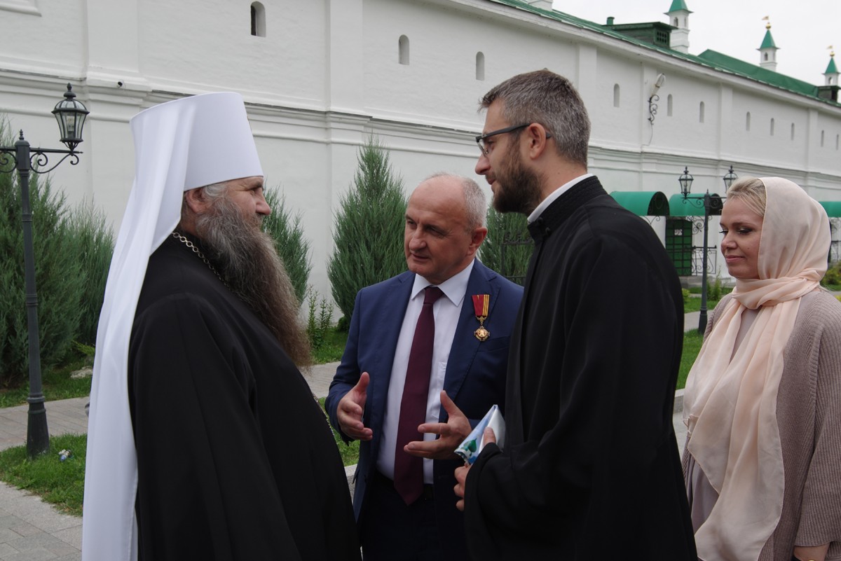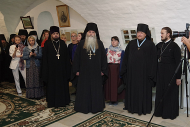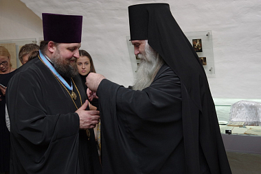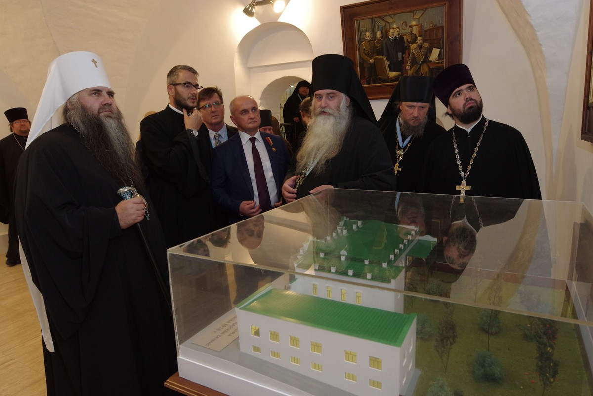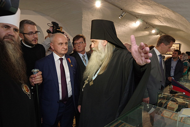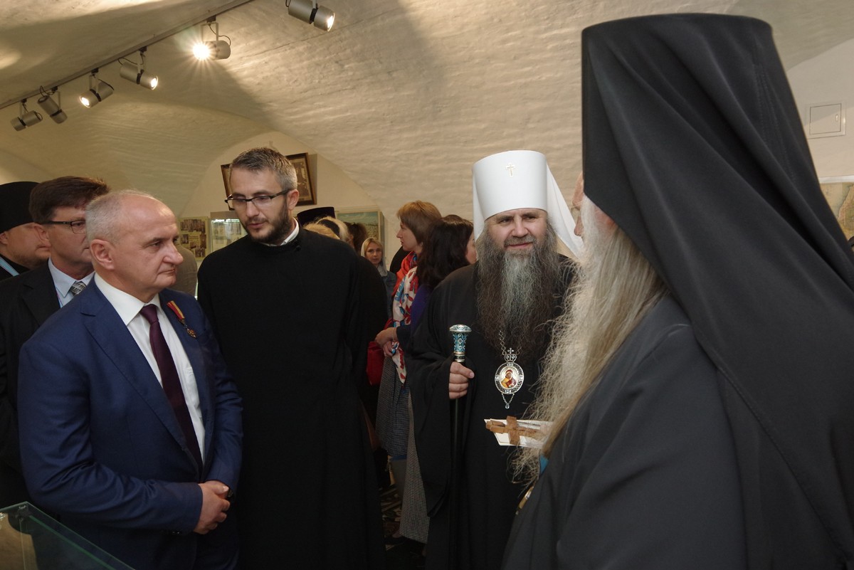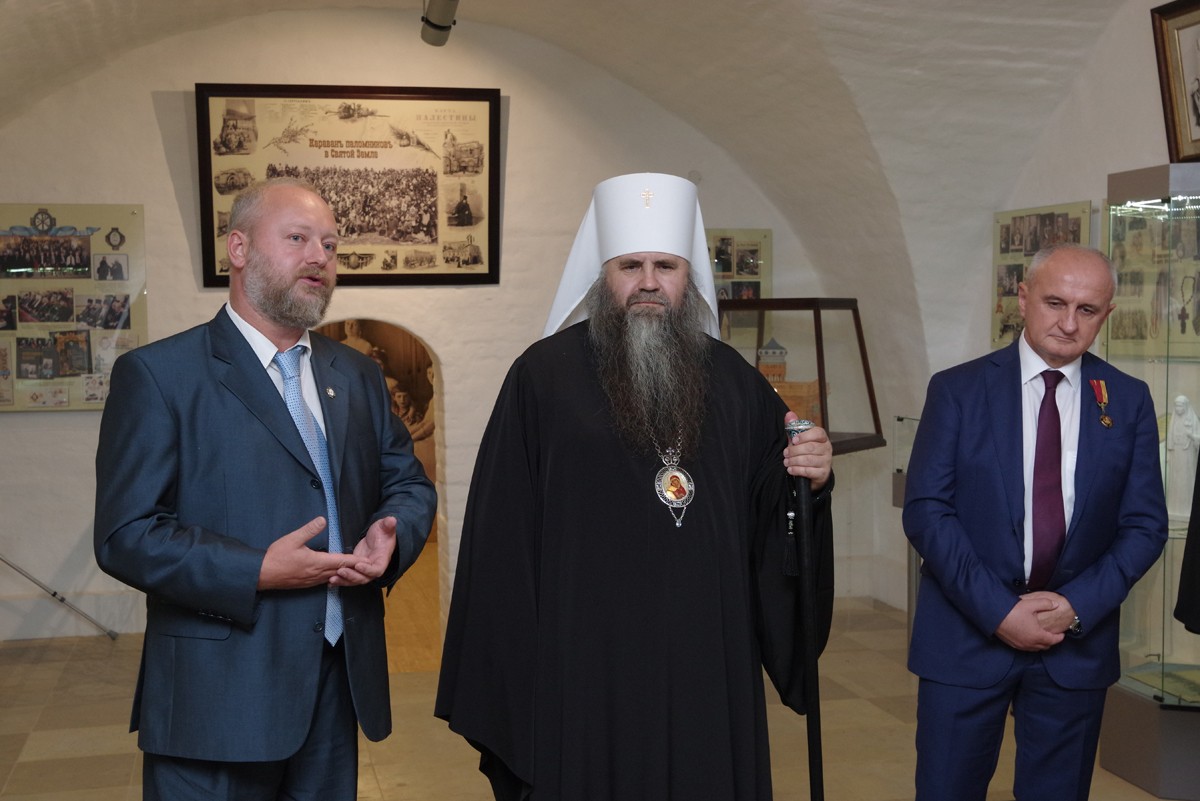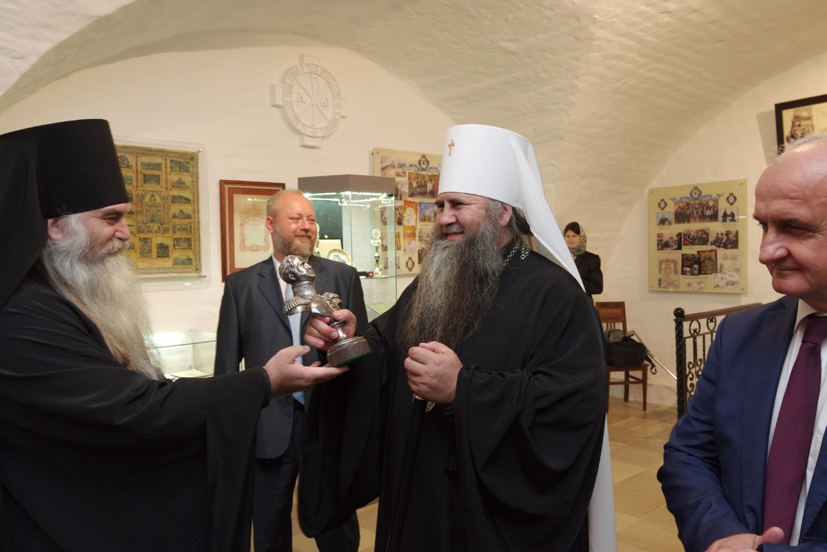 Архимандрит Тихон, выступая на церемонии, рассказал, как два года назад по благословению правящего архиерея начал создаваться музей, как собирались уникальные экспонаты. Настоятель Печерской обители поблагодарил владыку и преподнес ему в дар небольшой бюст императора Александра I.