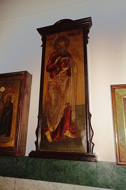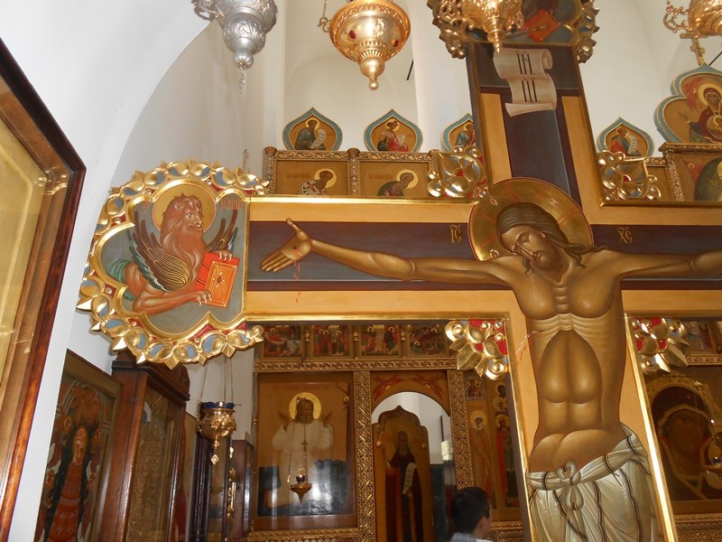 Апостол Иоанн Богослов символически изображен в виде льва по правую руку от Спасителя на Голгофе, которую написал для монастыря иконописец Валерий Поляков.