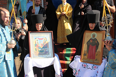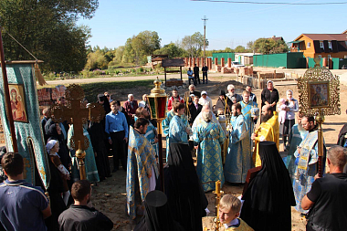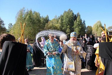 По окончании Литургии состоялся крестный ход к строящемуся храму в честь Святой равноапостольной Феклы, возле которого Владыка прочитал молитву святой первомученице.