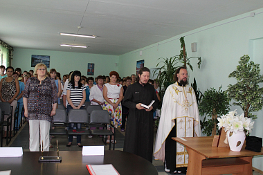 Перед подписанием договора настоятель Вознесенского монастыря, член попечительского совета пансионата игумен Марк (Алексеев) в сослужении с клириком обители иеродиаконом Андроником совершил молебен на начало доброго дела.