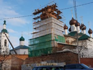 Заканчивается кирпичная кладка четвертого яруса колокольни Спасо-Пробоинского храма Кирилло-Афанасиевского мужского монастыря г. Ярославля.