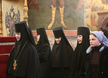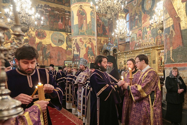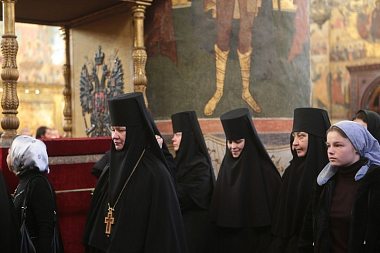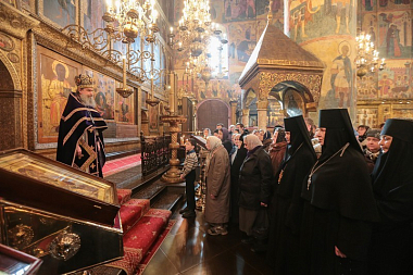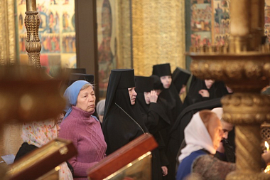 За Литургией молились: Заместитель Председателя Синодального отдела по монастырям и монашеству, настоятельница Зачатьевского ставропигиального женского монастыря игумения Иулиания (Каледа) с сестрами; наместник Заиконоспасского ставропигиального мужского монастыря архимандрит Петр (Афанасьев); настоятельница Богородице-Рождественского ставропигиального женского монастыря игумения Викторина (Перминова) с сестрами.