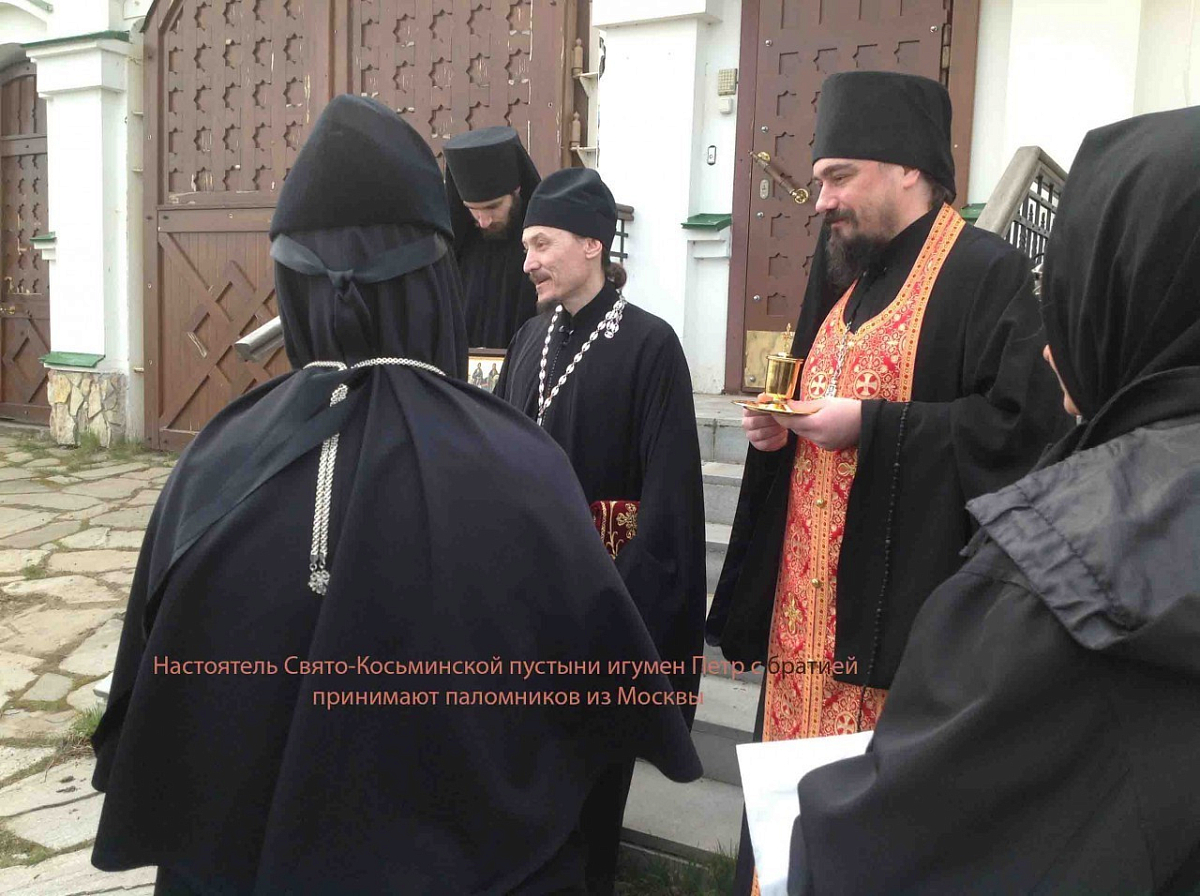 На пути в Верхотурье, паломники сделали краткую остановку у стен Свято-Косьминской мужской пустыни деревни Костылева, где поклонились мощам сибирских святых. Братия пустыни живет по афонскому уставу. Женщины не бывают на территории монастыря, поэтому братия с ковчегом мощей гостеприимно встретили паломниц у стен обители. По просьбе монахинь настоятель монастыря игумен Петр сказал слово назидания о любви ко Христу, которой исполняется сердце человека, пребывающего в молитве наедине с Богом. Игумен говорил о том, как важно уделять молитве хотя бы час времени по пробуждении от сна, когда особенно восприимчивой бывает человеческая душа. Приняв благословение Настоятеля, паломники отправились в Верхотурский Покровский женский монастырь поклониться мощам святого блаженного Косьмы.