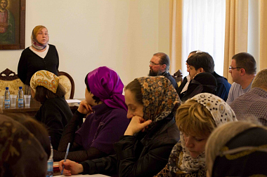 С сообщением об организации обучающих делопроизводству курсов перед собравшимися выступила Заместитель заведующего Отраслевого центра Всероссийского научно-исследовательского института документоведения и архивного дела Л.И. Зарипова. В своем выступлении Людмила Игоревна рассказала, что программа первого этапа обучения для заведующих монастырскими канцеляриями рассчитана на 24 часа. За это время специалисты в области документоведения и архивного дела познакомят учащихся с основными правилами работы с документами, помогут научиться создавать регламентирующие и иные документы, расскажут об особенностях эпохи электронных документов. Л.И. Зарипова обратила внимание участников совещания на то, что впервые слово делопроизводство было употреблено в 1584 году. Существующие в настоящее время правила организации делопроизводства создаются в том числе и для облегчения работы канцелярий.