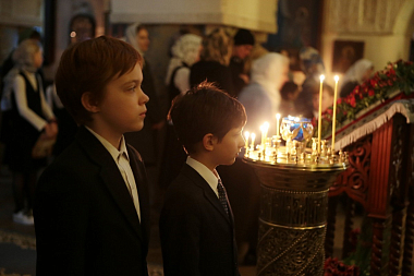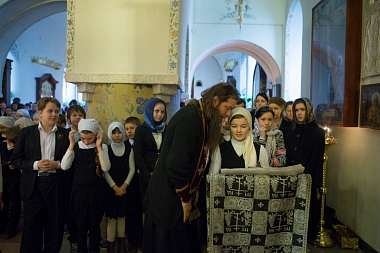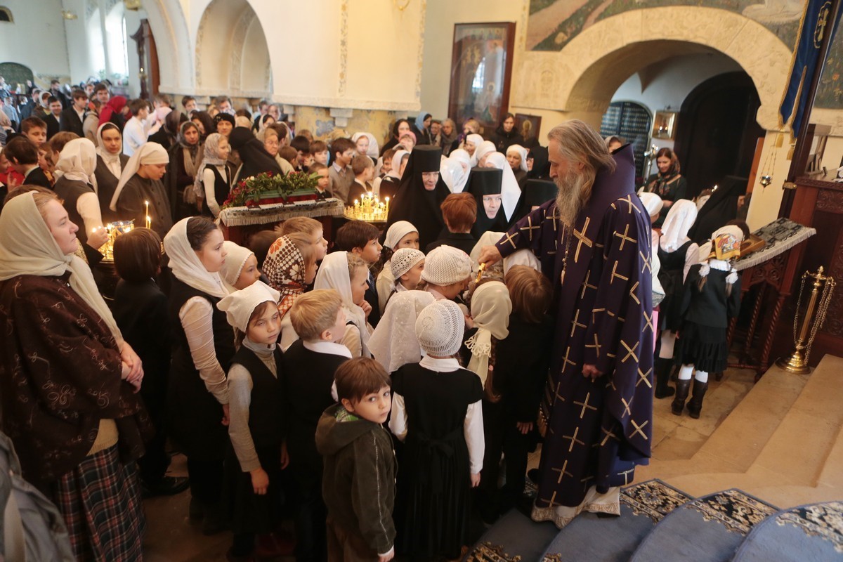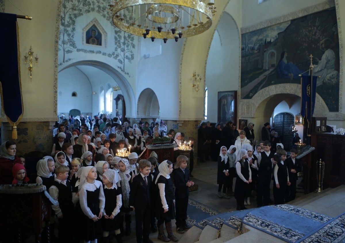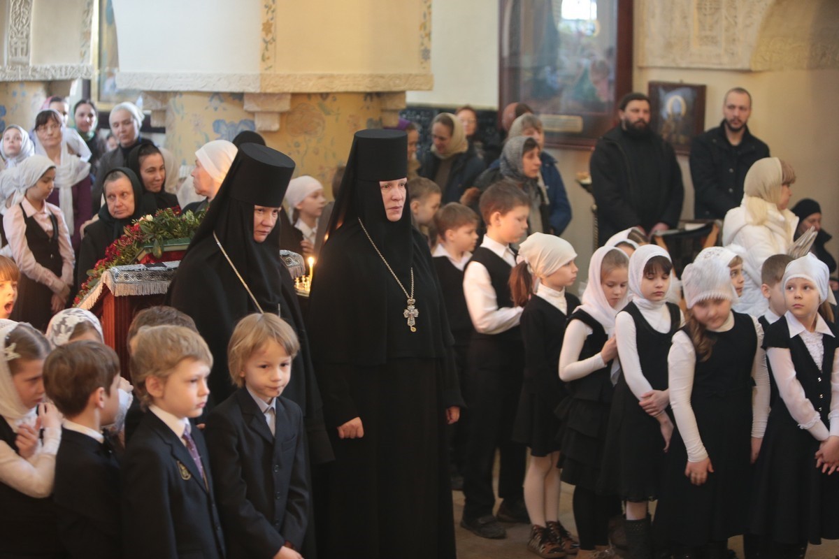 За богослужением молились члены коллегии Отдела: заместитель Председателя СОММ, настоятельница Зачатьевского ставропигиального женского монастыря г. Москвы игумения Иулиания (Каледа), настоятельница Богородице-Рождественского ставропигиального женского монастыря г. Москвы игумения Викторина (Перминова), сестры и прихожане обители, а также учащиеся Елисаветинской гимназии.