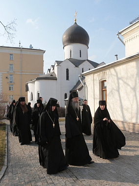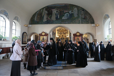 Его Высокопреосвященству сослужили заместитель Председателя Синодального отдела по монастырям и монашеству игумен Стефан (Тараканов), духовенство обители.
