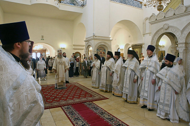 Его Высокопреосвященству сослужили: настоятель храма «Большое Вознесение» у Никитских ворот, секретарь Патриарха Московского и всея Руси по г. Москве протоиерей Владимир Диваков; наместник Николо-Угрешского ставропигиального мужского монастыря игумен Варфоломей (Петров); наместник Высоко-Петровского ставропигиального мужского монастыря Москвы игумен Петр (Еремеев); настоятель келии Святой Анны монастыря Иверон Святой Горы Афон архимандрит Антипа; настоятель храма Воскресения Христова в Кадашах протоиерей Александр Салтыков; настоятель храма Живоначальной Троицы на Грязех у Покровских ворот протоиерей Иоанн Каледа, монастырское духовенство; клирик Благовещенской епархии, прибывший на собеседование в Синодальный отдел по монастырям и монашеству.