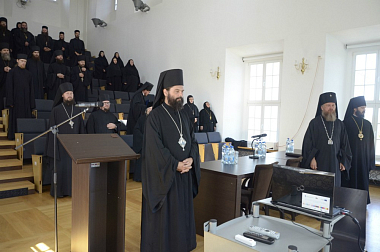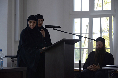 Игумения Феоксения зачитала собравшимся свое исследование «Место агрипнии (всенощного бдения) в монастырской программе».