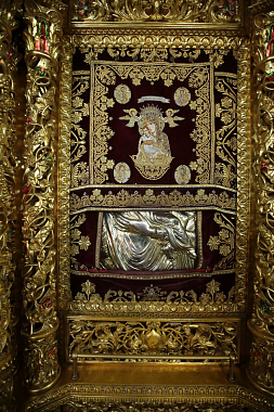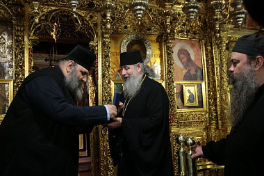 Затем паломники посетили «Трон Богородицы», расположенный на вершине одной из гор к северу от обители. Место деревянного трона, на который когда-то ставили икону, вознося молитвы Царице Небесной, занимает сегодня величественная кувуклия.
