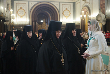 В этот день Предстоятеля Русской Православной Церкви от лица монашествующих поздравили председатель Синодального отдела по монастырям и монашеству, наместник Троице-Сергиевой лавры архиепископ Сергиево-Посадский Феогност; заместитель председателя Синодального отдела по монастырям и монашеству, настоятельница Зачатьевского ставропигиального женского монастыря Москвы игумения Иулиания (Каледа); игумены и игумении ставропигиальных и епархиальных монастырей.