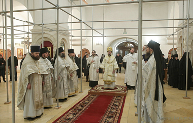 Его Преосвященству сослужили участники Рождественских чтений в священном сане и духовенство обители.