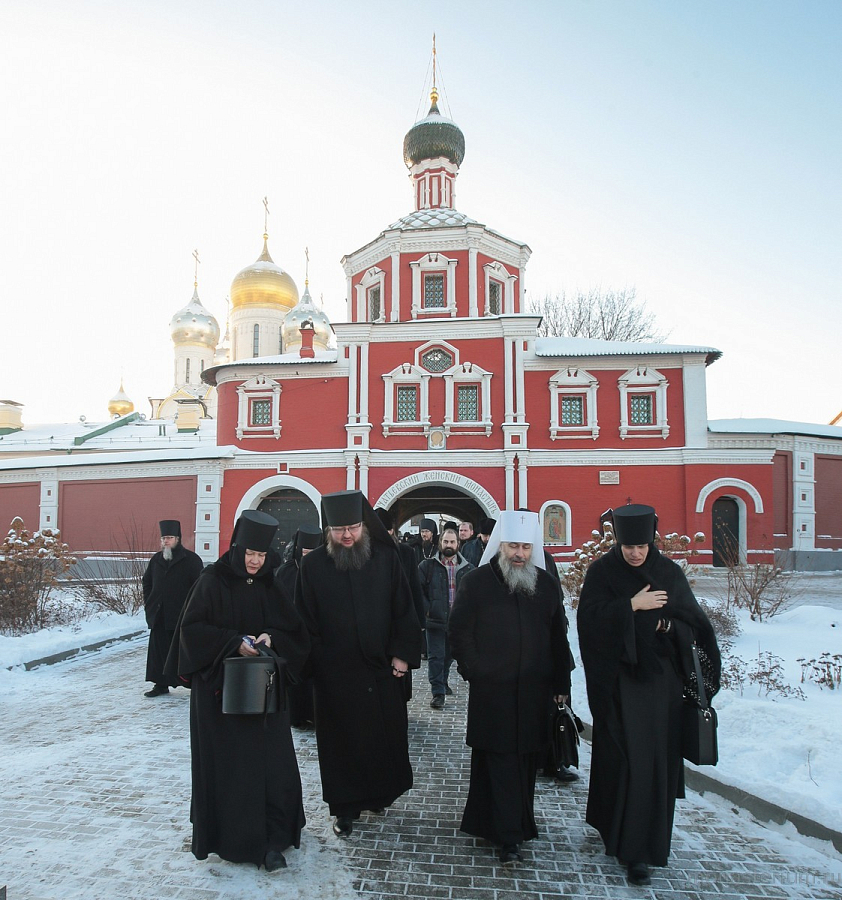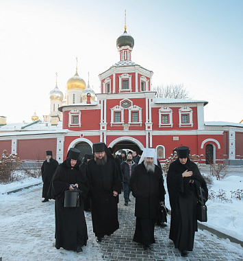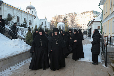 За Литургией молились: заместитель председателя Синодального отдела по монастырям и монашеству, настоятельница Зачатьевской обители игумения Иулиания (Каледа) с сестрами; член Коллегии Отдела, настоятельница Богородице-Рождественского ставропигиального женского монастыря игумения Викторина (Перминова) с сестрами; игумены и игумении, прибывшие на Рождественские чтения.