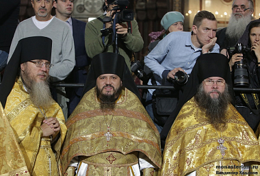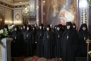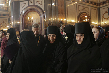 В Храме Христа Спасителя молились председатель Синодального отдела по взаимоотношениям Церкви с обществом и СМИ В.Р. Легойда, игумены и игумении монастырей, сотрудники синодальных учреждений, представители православных молодежных организаций, многочисленные верующие.