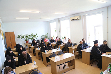 На базовой учебной площадке – в Центре подготовки церковных специалистов Волгоградской епархии члены комиссии встретились с руководством и преподавателями богословских курсов для монашествующих, игуменами и игумениями монастырей.