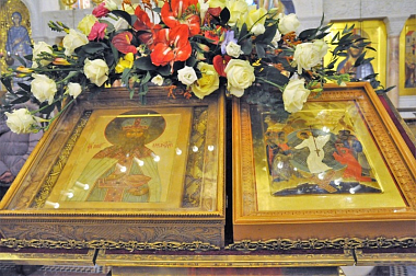 Затем духовенство и прихожане поздравили настоятеля с именинами, преподнесли Его Высокопреподобию цветы и подарки с пожеланиями помощи Божией, здоровья и многих лет жизни.
