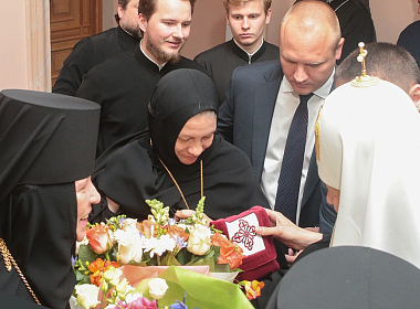 В этот же день Синодальный отдел по монастырям и монашеству поздравил Святейшего Патриарха Кирилла с днем тезоименитства. Его Святейшеству от лица монашествующих Русской Православной Церкви был преподнесен третий том книги «Слово к монашествующим. Проповеди Святейшего Патриарха Кирилла в монастырях».