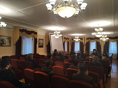 В актовом зале состоялась общая встреча ректора епископа Паисия, членов комиссии с преподавателями, игуменами и игумениями монастырей. На встрече обсуждались вопросы преподавания отдельных предметов для монашествующих, а также важность получения богословской подготовки для желающих принять постриг и всех насельников и насельниц монастырей. В заседании участвовали: иерей Роман Кацап, секретарь Курсов, проректор по учебной работе Курской духовной семинарии; игумен Питирим (Плаксин), настоятель Горнальского Свято-Николаевского Белогорского мужского монастыря; игумения Сусанна (Барыкина), настоятельница Свято-Троицкого женского монастыря города Курска; иеродиакон Вассиан (Самохин), заместитель игумена Свято-Николаевского Рыльского мужского монастыря; игумен Серафим (Котельников), наместник Курской Коренной Рождества Пресвятой Богородицы мужской пустыни; игумения Елисавета (Семенова), настоятельница Золотухинского женского монастыря преподобного Алексия, человека Божия; иерей Олег Рудыко, преподаватель Нового Завета; иерей Георгий Бекетов, преподаватель Православного вероучения и Основ Социальной Концепции; М. А. Адамов, преподаватель Общей церковной истории; Ю. В. Озеров, преподаватель Истории РПЦ; игумен Мелхиседек (Крахмалев), преподаватель Литургики; диакон Иаков Матросов, проректор по воспитательной работе Курской духовной семинарии.