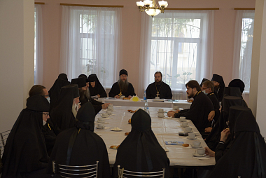 Работа Комиссии началась с посещения приходского дома храма Спас на Яру г Рязани, где в актовом зале была проведена встреча с настоятелями и настоятельницами монастырей и преподавателями курсов.