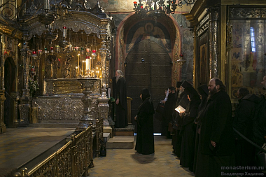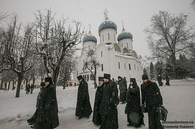 Перед началом собрания в Троицком соборе обители у мощей прп. Сергия Радонежского председатель Синодального отдела по монастырям и монашеству, наместник Троице-Сергиевой лавры архиепископ Сергиево-Посадский Феогност отслужил молебен, за которым молились все участники собрания.
