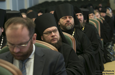В президиуме присутствовали: председатель Синодального отдела по монастырям и монашеству архиепископ Сергиево-Посадский Феогност; благочинный монастырей Московской епархии епископ Серпуховской Роман; член Коллегии СОММ, наместник Николо-Угрешского ставропигиального мужского монастыря игумен Варфоломей (Петров); председатель Межведомственной комиссии по образованию монашествующих, наместник Высоко-Петровского ставропигиального мужского монастыря игумен Петр (Еремеев).