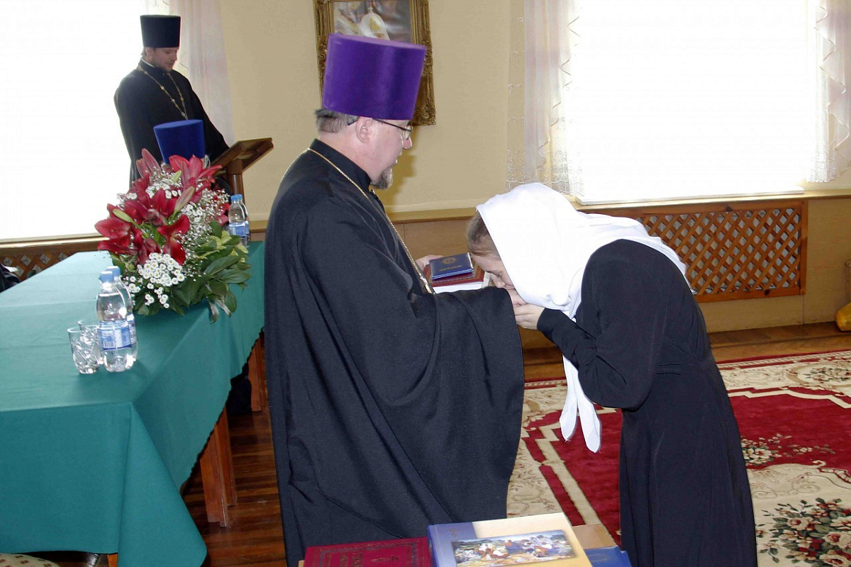 Затем в актовом зале Регентско-катехизаторского духовного училища на выпускном с докладом об успеваемости выпускниц выступил секретарь совета училища иерей Роман Шкадь. По прочтении доклада ректор РКДУ протоиерей Александр Опанасюк вручил дипломы семи выпускницам регентского отделения, в числе которых две насельницы Корецкой обители, и трем выпускницам швейного отделения.