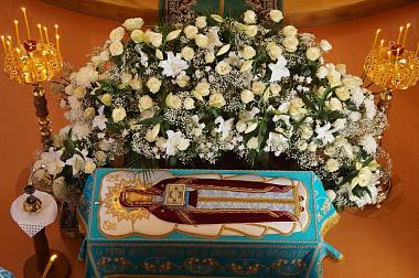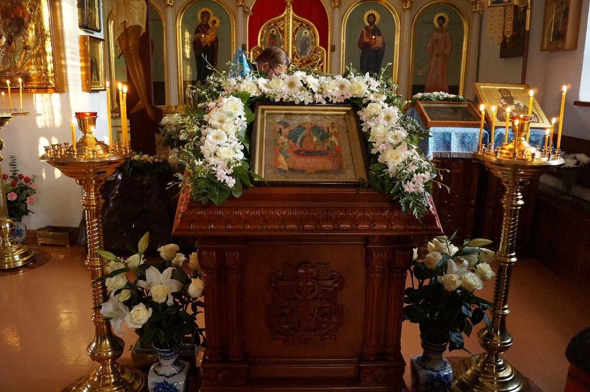 Во время Всенощного бдения Плащаница Божией Матери была вынесена на середину Троицкого храма и возложена на украшенную цветами гробницу.
