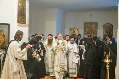Его Высокопреосвященству сослужили Заместитель Председателя Синодального отдела по монастырям и монашеству игумен Стефан (Тараканов) и духовенство обители.