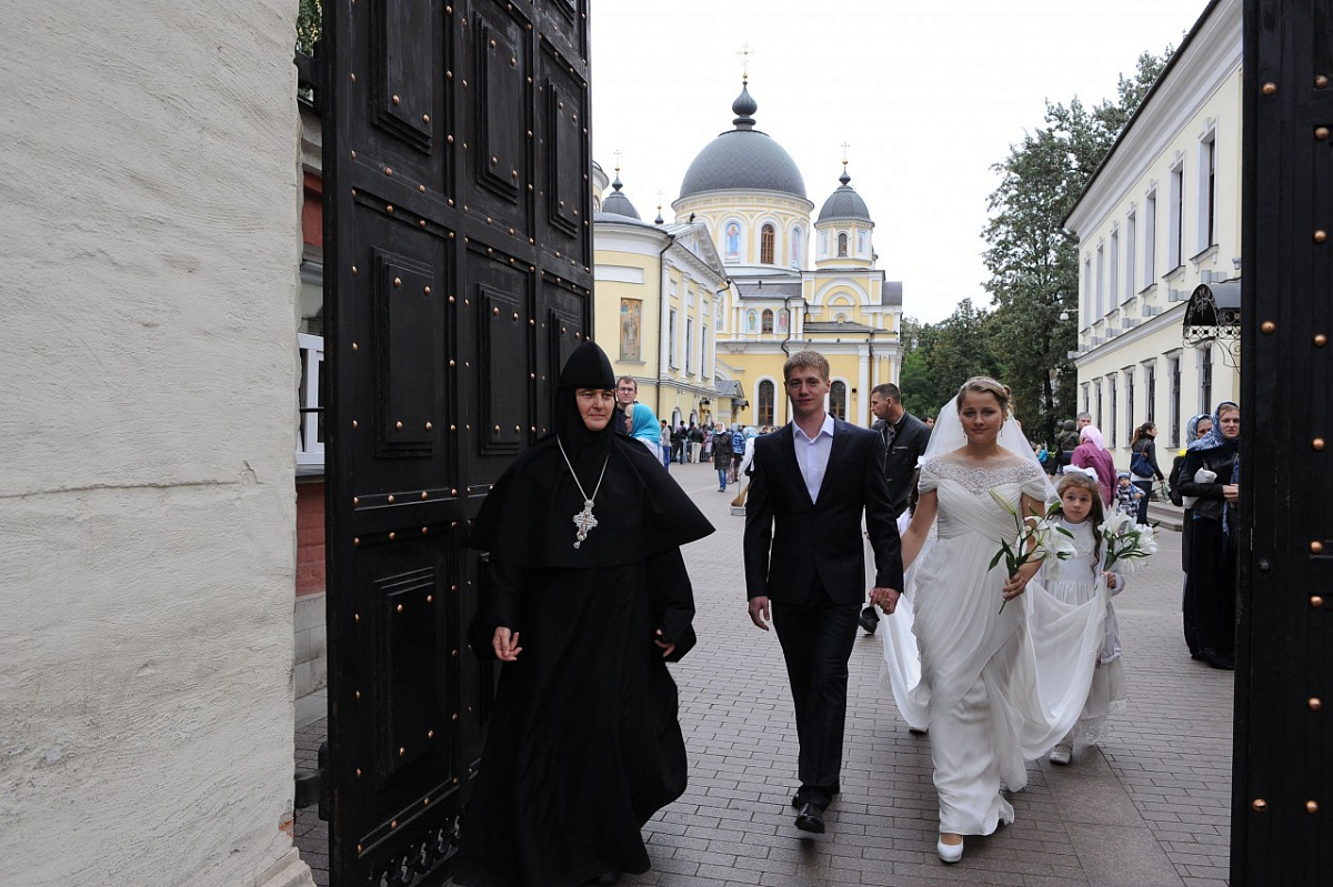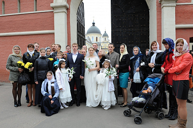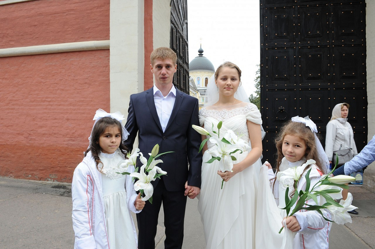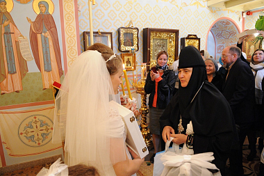По окончании торжества настоятельница Покровского ставропигиального женского монастыря Москвы игумения Феофания, воспитанницы приюта и прихожане храма поздравили новобрачных со знаменательным событием и вручили им цветы и подарки.