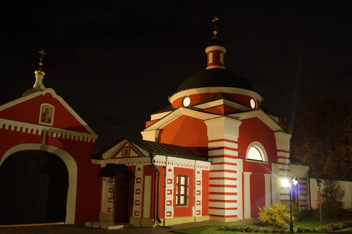 Основательница обители игумения Евгения (Мещерская) имела к этому святому особую веру и усердие. Потерявшая супруга вскоре после свадьбы, оставшись в ожидании младенца, окруженная недоброжелательством, двусмысленными пересудами и притязанием некоторых лиц на наследство мужа, молодая княгиня черпала силы в молитве и чтении духовных книг. Свт. Димитрий Ростовский был тот духовный писатель, сочинения которого благотворно подействовали на нее в первые годы вдовства. Припоминая много лет спустя свою тогдашнюю немощь, игумения Евгения называет святителя Димитрия своим целителем и приписывает ему «свое обращение от безумного мудрования». Вскоре после преобразования общины в монастырь одной из первых задач для вновь поставленной игумении стало устроение святых врат обители и при них небольшой церкви для отправления разных треб мирских прихожан. Меньше чем через год привратный храм был построен и освящен митрополитом Московским Филаретом.