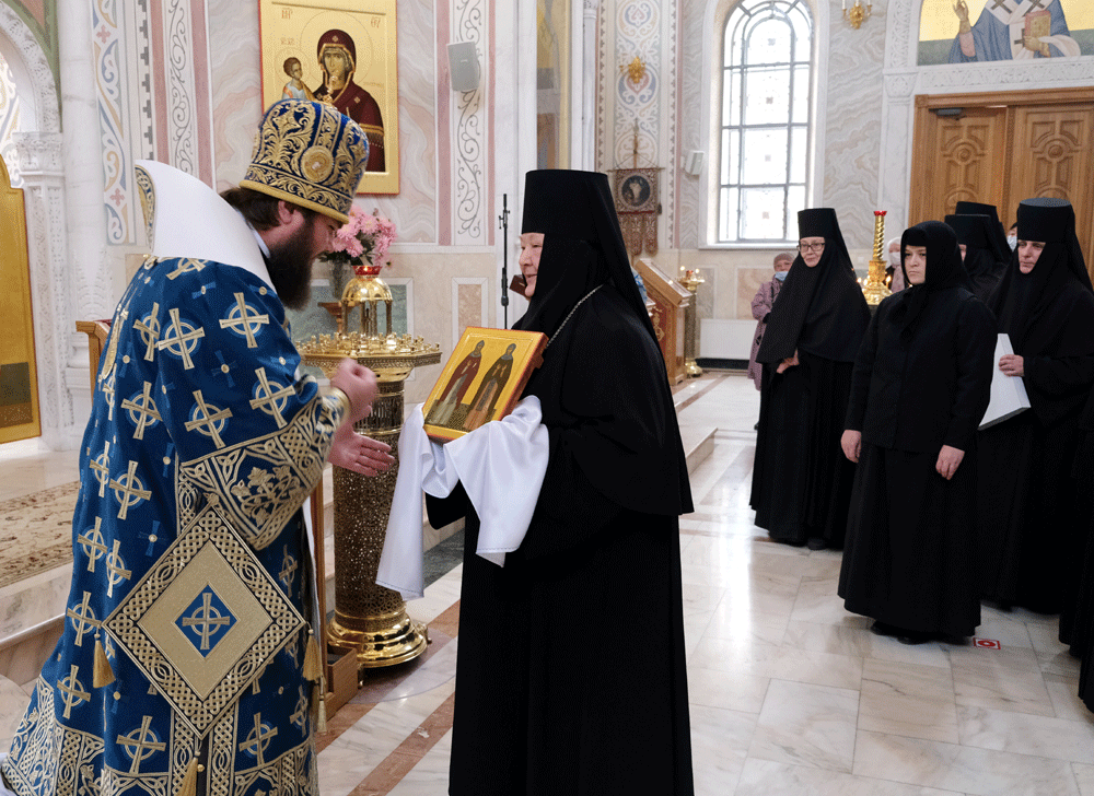 Затем матушка игумения преподнесла епископу Фоме в дар икону преподобных Кирилла и Марии, Радонежских и Хотьковских чудотворцев, написанную сестрами обители.