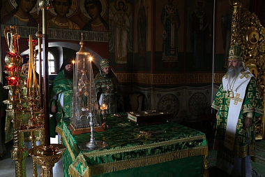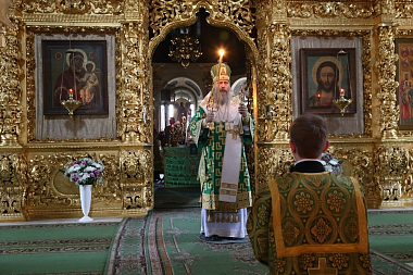 Божественную литургию в Успенском соборе монастыря совершил Председатель Синодального отдела по монастырям и монашеству архиепископ Сергиево-Посадский Феогност.