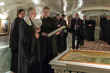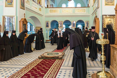 В обители Святейшего Владыку встречали настоятельница Иоанновского монастыря игумения Людмила (Волошина), священнослужители и сестры. В храме-усыпальнице Его Святейшество совершил молитву святому праведному Иоанну Кронштадтскому и поклонился мощам святого. В соборе Двенадцати апостолов, главном храме обители, Святейший Патриарх Кирилл обратился к присутствовавшим с приветственным словом: