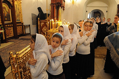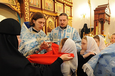 В этот день была отслужена Божественная литургия, за которой молились настоятельница Покровского монастыря игумения Феофания, насельницы обители, воспитанницы приюта для девочек при Покровском монастыре и паломники.