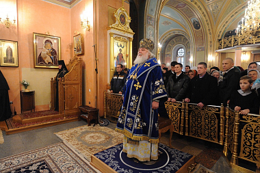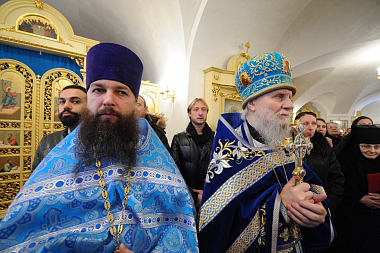 Его Высокопреосвященству сослужили: протоиерей Владимир Диваков, секретарь Патриарха Московского и всея Руси по г. Москве; протоиерей Александр Абрамов, благочинный Покровского округа г. Москвы, настоятель храма Свт. Мартина Исповедника в Алексеевской Новой Слободе; духовенство г. Москвы.