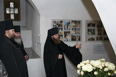 Затем владыки, братия обители направились в храм-усыпальницу, где ознакомились с представленной выставкой, посвященной памяти владыки Алексия. В рамках выставки экспонируются личные вещи владыки Алексия, его дипломы и награды. Одна из них – за строительство Храма Христа Спасителя. На экспозиции представлены фотографии разных лет и важные события в жизни Новоспасского монастыря. Все пришедшие также смогли увидеть дикирий, трикирий, клобук почившего иерарха.