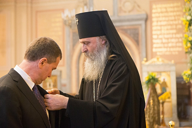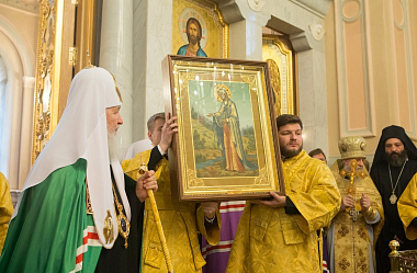 В дар новоосвященному собору Святейший Патриарх Кирилл передал список Пюхтицкой иконы Божией Матери.