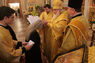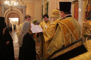 По окончании Всенощного бдения был совершен монашеский постриг насельницы Иоанно-Предтеченской обители инокини Иларии (Харченко) с наречением имени в честь св. мц. Феониллы, а за Божественной литургией – иноческий постриг насельницы обители послушницы Анны (Грачевой) с наречением имени в честь прп. Михея Радонежского.