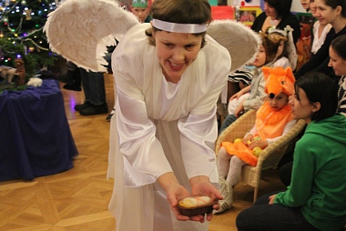 Сначала детям и родителям показали спектакль «Дорогой Рождества», в котором участвовали дети. Конечная станция новогоднего паровозика – «Рождество», а по пути встречались станции «Лесная», «Снежная» и многие другие, где нужно было проявить свою смекалку или побороться за спасение праздника.