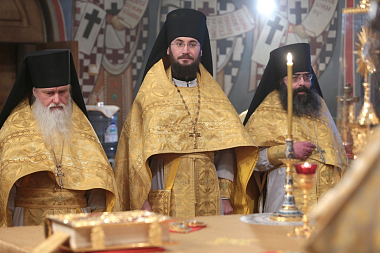 Его Высокопреосвященству сослужили: наместник Высоко-Петровского ставропигиального мужского монастыря игумен Петр (Еремеев); наместник Николо-Угрешского ставропигиального мужского монастыря игумен Варфоломей (Петров) и др.