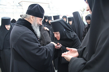 10 января Блаженнейший Митрополит Киевский и всея Украины Онуфрий молился за Литургией в Троицком храме обители, после чего благословил игумению и сестер обители.