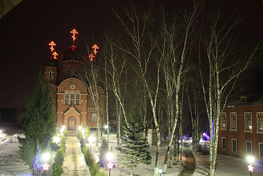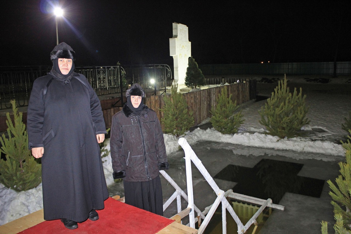 Вырезанная в виде креста купель, красная ковровая дорожка, теплая раздевалка были подготовлены заранее по благословению игумении Екатерины, настоятельницы монастыря.